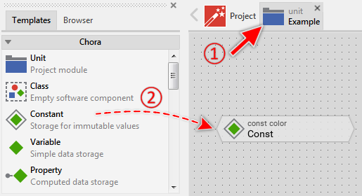 With a constant member you can define a global immutable value. You use constants typically to store strings (text) or frequently used configuration parameters like colors, etc. Constant members are represented in Composer by following bricks: