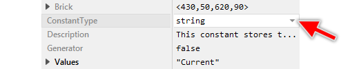The attribute ConstantType determines the data type of the value (or values) stored in a constant member. Please note, unlike mutable variables, a constant can't store any references. It is thus not possible to configure a constant with a reference data type like object, property reference, class, slot or even handle.