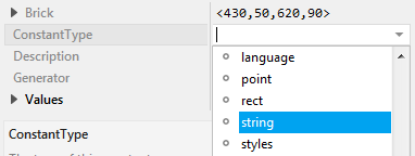 To inspect or modify the value of a ConstantType attribute, select first the affected constant member. Thereupon, the attribute is listed in the middle area of Inspector. Please note the available assistant you can activate by clicking on the button