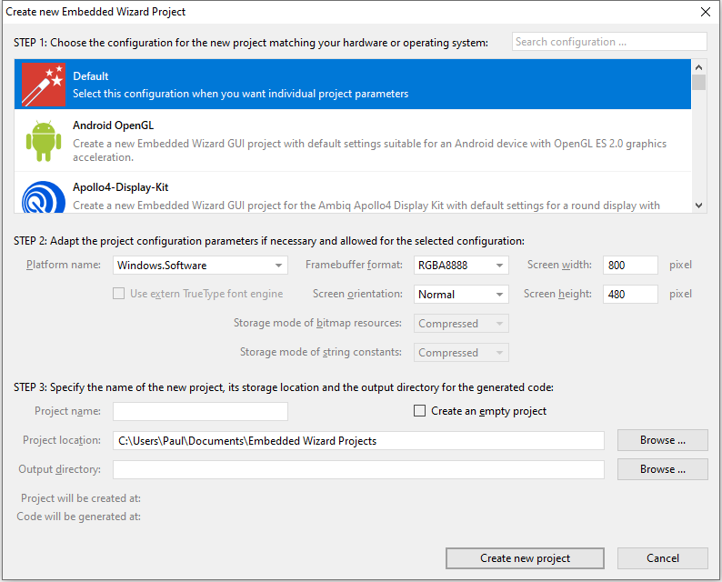 Per default new projects are created in the Embedded Wizard Projects sub-directory of your documents folder. You can however specify another location where to store the new project: