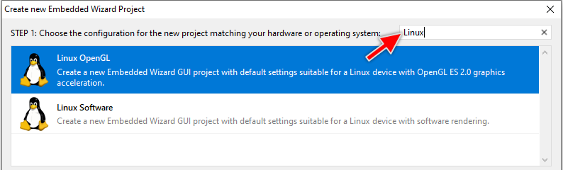 The list includes also few generic configurations detached from a dedicated MCU or MPU but restricted to a concrete operating system. For example, when you develop the GUI application for a Linux system, you can select between Linux OpenGL or Linux Software. The most generic configuration, however, is the first one in the list called Default. You select this configuration when you intend to address an MCU/MPU architecture and operating system not listed in the dialog. Selecting Default implies that you want to adjust all configuration parameters manually.
