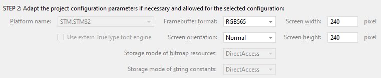 The both parameters determine the size (the resolution) of the framebuffer in pixel. If the GUI application is intended to run within a window (e.g. under Microsoft Windows), the parameters also determine the size of the window. The values also affect the amount of RAM needed to store the framebuffer. When creating the project, the parameters are taken over into the attribute ScreenSize of the profile member. |