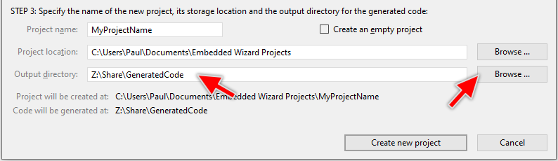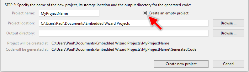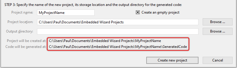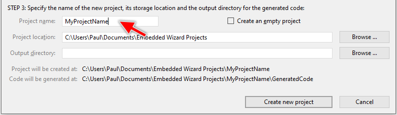 Please note, Embedded Wizard creates for the project a new sub-directory named after the project name. For example, when the project name is MyProjectName, Embedded Wizard will create within the location directory a new sub-directory also called MyProjectName and store there all project files. For your convenience the complete path to the new directory is displayed in the bottom area of the dialog. Similarly, the dialog displays the path to the directory where the code is generated: