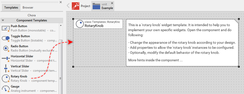 To create a new component from a template you simply Drag & Drop it between the Templates window and the Composer with an opened unit. This is important in that by using the component templates you add in fact a new class to your project. Classes, in turn, can exist within units only. The following are the typical steps to create a new component from a template: