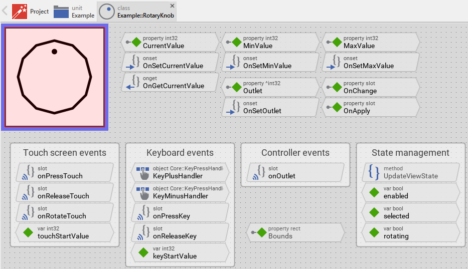 Once you have created a new component, you can open the component class for editing. Thereupon the component appears in a new Composer page. For example, if you have created a new Rotary Knob component, the Composer window displays following contents: