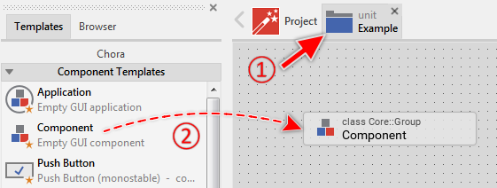 The new created component receives per default a name identifying it uniquely within the current unit e.g. Component6. Thus it is recommended, that after being created you rename the component explicitly according to its later function. For example, if you intend to implement a slider widget, you can name the component Slider.