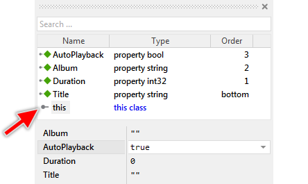In this manner you can conveniently evaluate or modify the properties. By modifying the properties you determine the default values valid for all instances of the class and other classes derived from it. Let's assume, you have developed a class to maintain a record from a song play list. Now, you want all instances of this class to have the property AutoPlayback being set true. In such case, change the property AutoPlayback of the selected this member to the value true. Later, when you create an instance of the affected class, the instance will have this initialization value unless you explicitly change it.