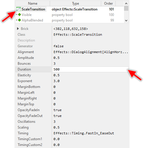 Per default, the Scale Transition takes 500 ms for its animation. With the property Duration you can specify another value in milliseconds.