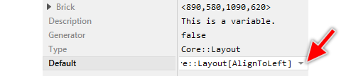 To inspect or modify the value of a Default attribute, select first the affected variable or property member. Thereupon, the attribute is listed in the middle area of Inspector. Depending on the data type of the member, an additional assistant may be available you can activate by clicking on the button