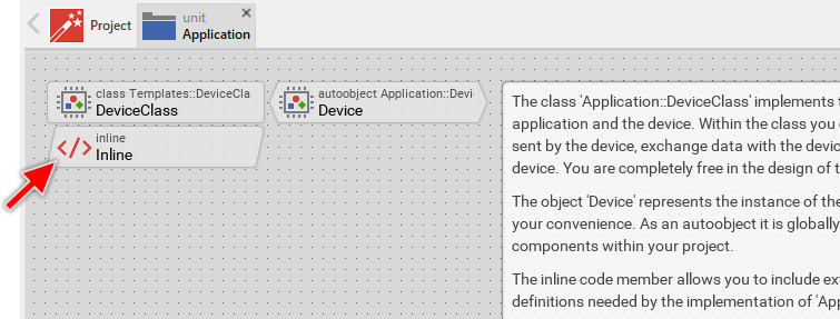 The Inline Code member, in turn, is intended to incorporate to the project all relevant external dependencies like C header files, type declarations or even complete functions. In fact, whatever you put within the Inline Code member will be taken over during the code generation as it is. The implementation of the Device Interface can then access this code. If not necessary, you can select and delete the Inline Code member.