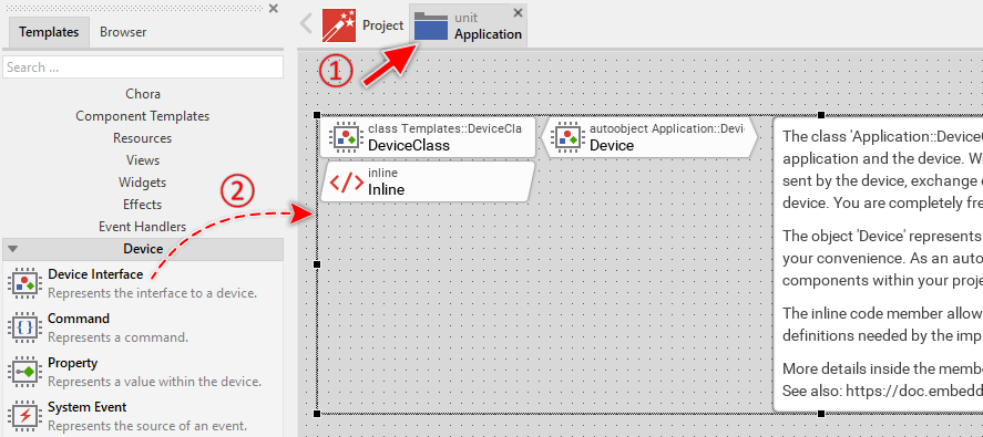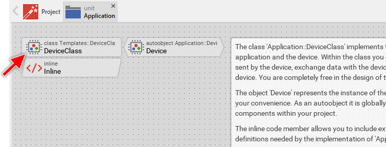 In order to access the functionality implemented in the Device Interface it is necessary to either create a new or query an existing instance of the respective Device Interface class. For your convenience such instance is provided implicitly when you add a new Device Interface to your project. It is represented by the global autoobject member named per default Device. The advantage of such global autoobject is that the application can access it from everywhere easily: