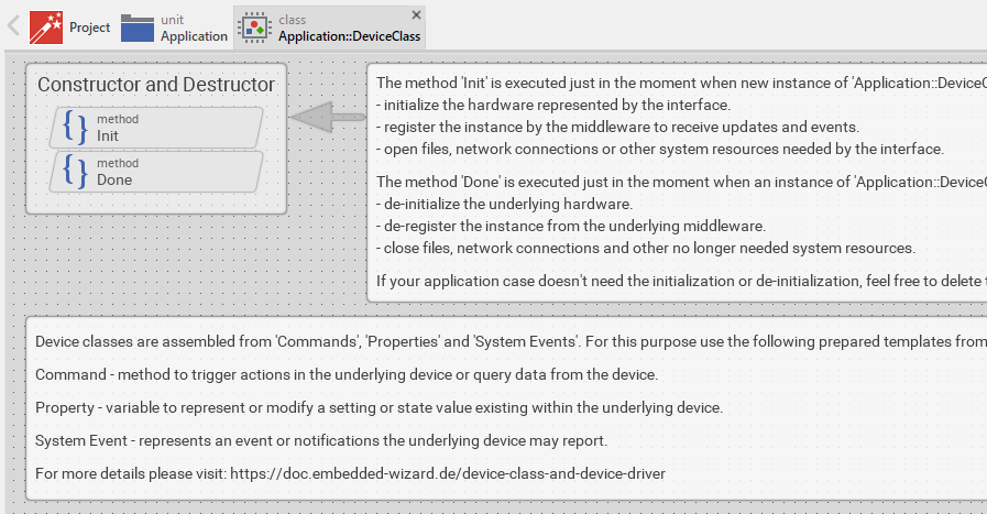 Per default the new created Device Interface contains an Init and a Done method. These serve as so-called constructor and destructor. At the runtime Init is invoked automatically as soon as the Device Interface is instantiated. This is usually the case when a GUI component accesses the autoobject associated to the Device Interface for the first time. The Done method, in turn, is invoked when a Device Interface instance is disposed, means the autoobject is not referenced anymore by any existing GUI component.