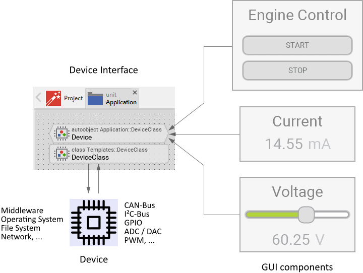 A further advantage of abstracting the interface is the high flexibility of the developed GUI application when it comes to its adaptation to new hardware and software controlling the device. When applied consequently, the effort to bring up the GUI to a new system limits to the replacement of the Device Interface. Even the creation of a single GUI being able to control several product and hardware variants is possible.
