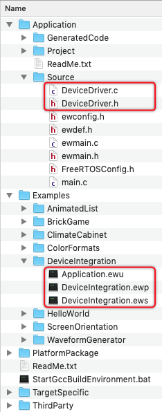 The Embedded Wizard project containing this example can be found in the folder Examples\DeviceIntegration within the respective Build Environment package. Furthermore, in the folder Application\Source you can find the files DeviceDriver.h and DeviceDriver.c. These implement diverse C functions needed by the Device Integration example. Following figure demonstrates the structure of a Build Environment and the locations where the mentioned files are found: