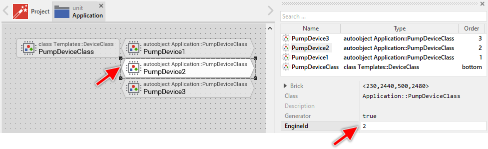 This approach expects, that the instances store some parameters identifying explicitly the corresponding pump engines. This can be achieved by adding an ordinary property member to the Device Interface class. The initialization value of such EngineId property addresses thereupon the corresponding engine. In the simplest case, the property could store an integer value 1, 2 or 3. When you select the autoobject representing a Device Interface instance, the Inspector window lists all properties belonging to it. Now you can initialize the EngineId property with the right value. For example, 2 in case of the instance controlling the second pump: