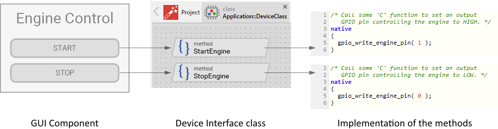 The figure below demonstrates the principle concept of a Command as interface between the GUI application and the device. On the left you see a GUI component containing two push buttons. Each time the user activates a button, the associated Command method implemented in the Device Interface class is invoked. Thereupon the implementation of the method is executed. The implementation, on the other hand, contains a section of native code, where some C function (here an imaginary function gpio_write_engine_pin()) is called. Assuming, the corresponding GPIO pin controls the power supply of the engine in your device, modifying its state causes the engine to be started or stopped: