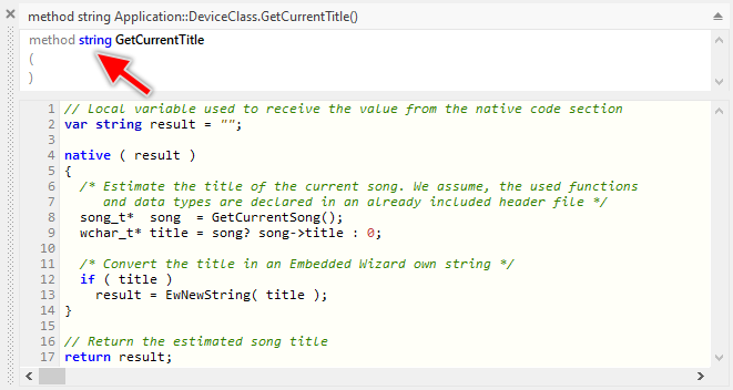 The following figure demonstrates the declaration and the implementation of such method to query the current song title. Please note, the method uses imaginary C functions and type definitions to determine which song is actually played and to query its title. You can imagine, that in a real project you would need to implement similar code to get the respective information: