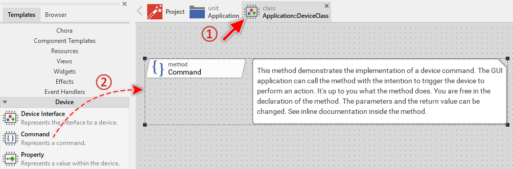 The main aim of a Command is to perform an operation in the device. For example, to start an engine or to query the status of the device. These operations require the implementation of the Command method to access hardware specific GPIOs, use operating system services or call other software routines existing outside of the GUI application. You implement this functionality in the Code Editor window.