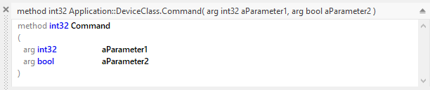 Newly added Command methods comes with one int32 and second bool parameter named consequently aParameter1 and aParameter2. These parameters exist mainly for demonstration purpose and for your convenience to simplify the creation of new Commands. In the practice, however, after adding a new Command you should adapt the declaration of the method to the needs of the particular operation represented by it. Following figure demonstrates the per default existing parameters: