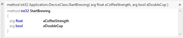 Once declared, you can evaluate the parameters in the implementation of the Command method. You can even pass the parameters to the native code and evaluate them there directly. Following figure demonstrates the usage of the both approaches in a finished StartBrewing method:
