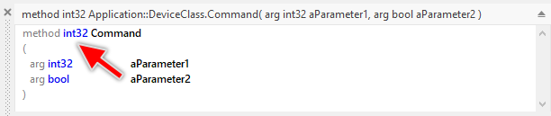 The newly added Command methods are per default declared to return an int32 value. This return value exists mainly for demonstration purpose and for your convenience to simplify the creation of new Commands. In the practice, however, after adding a new Command you should adapt the declaration of the method to the needs of the particular operation represented by it. Following figure demonstrates the per default existing return value: