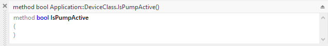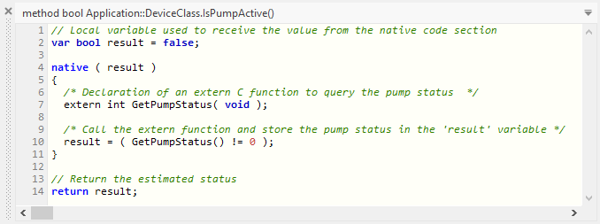 The editing of the method return data type takes place in the declaration area of the Code Editor window. How you do this exactly is explained in the section Edit the return data type of the method. Once declared the return data type, you have to adapt the implementation of the Command method to return a value matching this data type. In case of the above mentioned example of an IsPumpActive method, the implementation could look as shown in the figure below:
