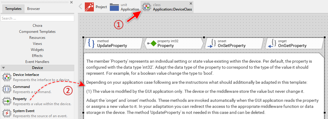 Please note, the here explained Device Interface Property is based on the more generic Property member found in the Chora programming language. It enhances the generic property by additional features needed for the integration with the device and implements functionality to trigger notifications when the value of the Property is changed.