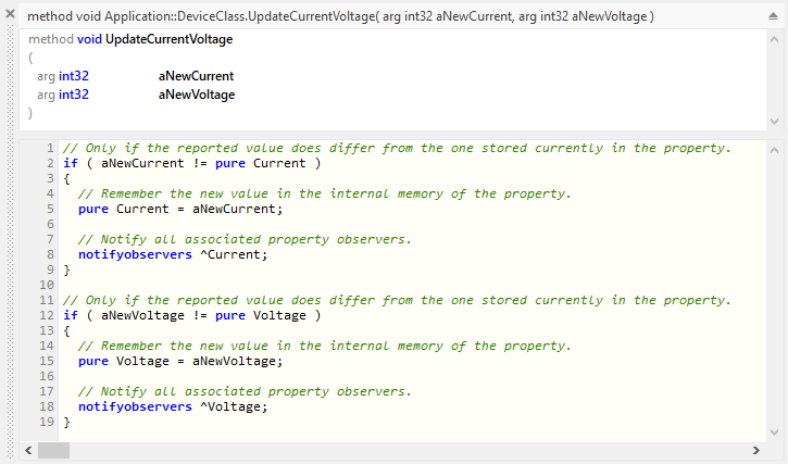 All onset methods follow the same implementation scheme. In the first step they verify whether the just assigned new value is equal to the stored already in the internal memory of the Property addressed by the keyword pure. If this is not the case, the new value is stored in this internal memory. Then follows a native code section enclosing all the operations to execute on the device when the Property is changed. Finally, at the end the methods trigger notifications to all observers tracking alternations of the Properties.