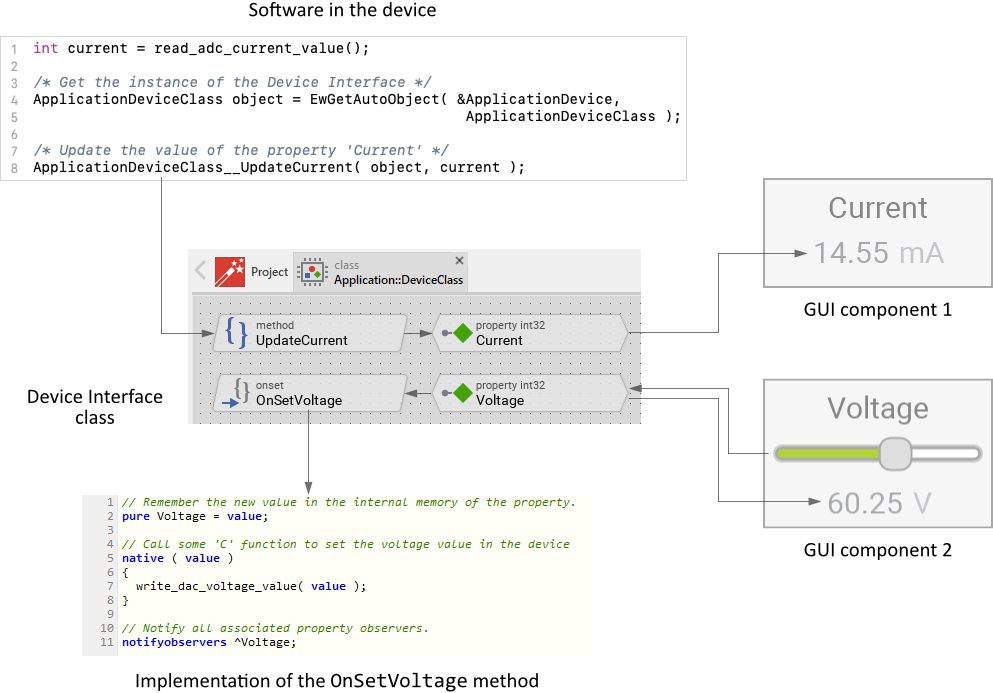#include "Application.h" [...] /* Obtain access to the Device Interface instance */ ApplicationDeviceClass device = EwGetAutoObject( &ApplicationDevice, ApplicationDeviceClass ); int newCurrent = 1200; /* e.g. 1200 mA */ int newVoltage = 380; /* e.g. 380 mV */ /* Invoke the function to update the Properties. Provide the corresponding values for the Properties. */ ApplicationDeviceClass__UpdateCurrentVoltage( device, newCurrent, newVoltage );