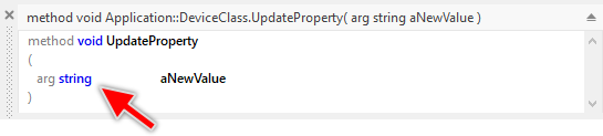 The Update method is per default declared with a single parameter of type int32 matching the default data type of each new added Property. The editing of method parameters takes place in the declaration area of the Code Editor window. How you edit the declaration of an existing parameter is explained in the section Edit an existing method parameter. For example, if you have changed the data type of the Property to string you should adapt accordingly the unique parameter of this method as shown in the figure below: