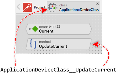 Similarly in the second part, the name of the function to invoke is composed of the unit containing the Device Interface class, the name of the Device Interface class itself, a double underscore __ and the name of the method intended to update the Property. The following figure demonstrates how the above used function name is derived: