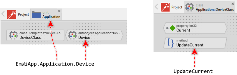 The identifiers used in the first part correspond to the name of the global autoobject instance representing the Device Interface and the unit containing the Device Interface. The identifier EmWiApp represents the instance of the GUI application itself. Please note, that this default name EmWiApp can be modified by specifying another name in the attribute ApplicationName. Similarly in the second part, the name of the function to invoke matches the name of the method intended to update the Property. The following figure demonstrates how the diverse identifiers are determined: