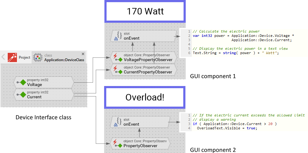 The figure below demonstrates the principle function of a Property Observer. In this example we assume that the GUI belongs to a laboratory power supply device. In such device, the measured electric current and voltage should be displayed on the screen. The corresponding Device Interface is thus composed of two Properties Voltage and Current representing the respective values in the device. The both GUI components, in turn, contain Property Observers connected to the Properties. Consequently, when one Property is changed, the respective Observers are notified automatically. The Observers signal thereupon their associated slot methods onEvent. The slot methods are executed updating e.g. the appearance of the belonging GUI components or presenting alerts, etc. For example, the implementation in the first component calculates and displays the actual electric power: