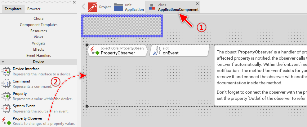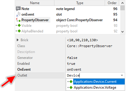 In order to react to events, you have to connect the Property Observer to the corresponding Property existing usually in a Device Interface. This connection is established by simply initializing the property Outlet of the respective Observer with a reference to the Property of interest. With the Inspector Assistant you can conveniently select the right Property when you edit the initialization expression for the property Outlet. For example: