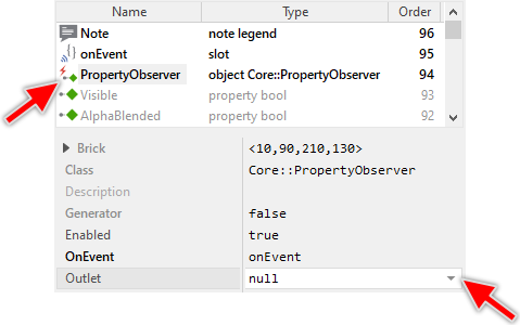 New added Property Observers provide per default an own onEvent slot method connected already to their OnEvent property. Usually after adding a new Handler you will open this slot method for editing and modify its implementation as required in your application case. You can, of course, rename or even remove the default slot method and replace it by your own. In such case, don't forget to assign the new slot method to the property OnEvent of the affected Property Observer object.