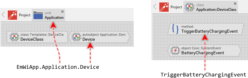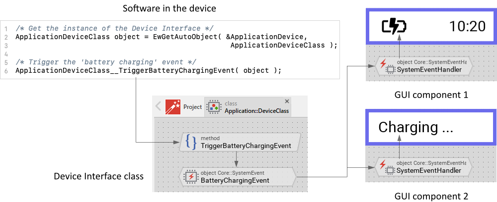 #include "Application.h" [...] /* Obtain access to the Device Interface instance */ ApplicationDeviceClass device = EwGetAutoObject( &ApplicationDevice, ApplicationDeviceClass ); /* Invoke the function to trigger the event */ ApplicationDeviceClass__TriggerBatteryChargingEvent( device );