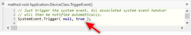 Once the method is opened in the Code Editor you see that it contains an invocation of a Trigger method belonging to the System Event object. This invocation expects in its last parameter a boolean value. Changing this parameter to the value true will ensure that the System Event is placed in front of all other actually waiting events: