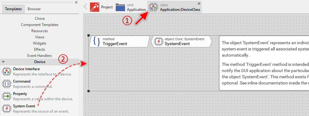 In the screenshot above you see that new added System Events consist of two members: a method and an object. While the object represents the actual System Event, the method serves as the entry point for the external software running on the device. When the event occurs the software invokes the method and triggers so the associated System Event object. The both members are also accompanied by an annotation providing helpful tips how to proceed. If undesired, you can select and delete the annotation.