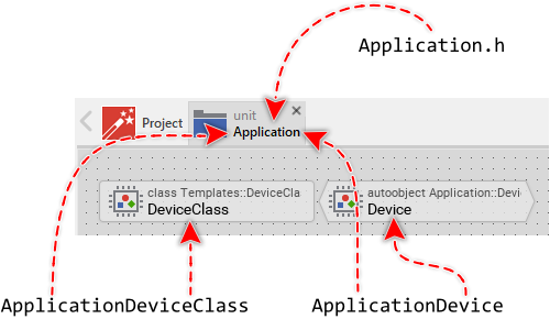 The identifiers used in the first part correspond to the names of the Device Interface class and its associated global autoobject instance. These identifiers are simply derived by concatenating the name of the unit containing the Device Interface class with the name of the class or autoobject itself. The name of the header file used in the #include directive corresponds also to the name of the unit itself. The following figure demonstrates how the diverse identifiers are determined: