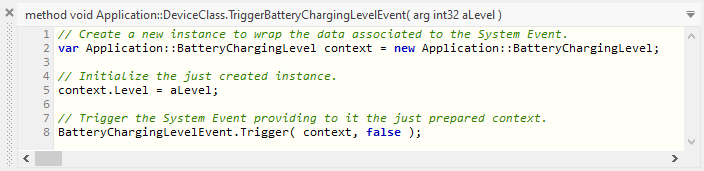 #include "Application.h" [...] /* Obtain access to the Device Interface instance */ ApplicationDeviceClass device = EwGetAutoObject( &ApplicationDevice, ApplicationDeviceClass ); int level = 30; /* e.g. 30 % battery charging level */ /* Invoke the function to trigger the event and pass the value to it */ ApplicationDeviceClass__TriggerBatteryChargingLevelEvent( device, level );