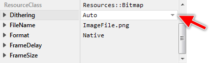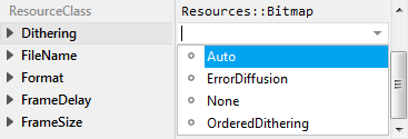 To inspect or modify the value of a Dithering attribute, select first the affected bitmap resource member. Thereupon, the attribute is listed in the middle area of Inspector. Please note the available assistant you can activate by clicking on the button