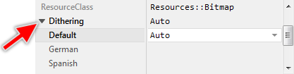 The attribute Dithering can be localized allowing the creation of bitmap resource members with language dependent dithering modes. For this purpose expand the attribute by clicking on the small triangle left to the attribute. All available language specific values are listed thereupon below the attribute and can be modified individually: