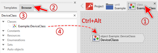 Starting with Embedded Wizard 9.0 it is not required to hold the keys CtrlAlt pressed during the drag-and-drop operation when you intend to create an embedded object. You can simply select in the Browser window the desired class, grab it and drop it into the Composer window. The keys CtrlAlt are optional in this particular case.