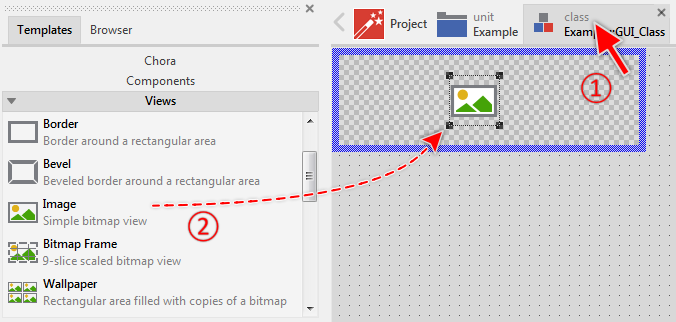 Embedded Wizard provides various templates for all important objects, like the views, event handlers, widgets or animation effects. These templates offer a convenient approach to embed new objects within a class. The templates are found in the folders of the Gallery. For example, the folder Views contains templates for all view objects. Let's assume, you are editing a GUI component and you want to add an image view object to it, then do following: