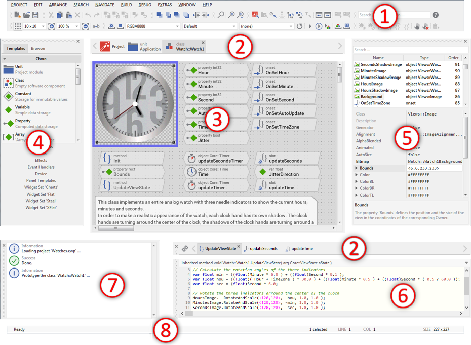 The main editor of the Embedded Wizard Studio. It provides a simple visual programming environment, where you assemble your GUI components and the entire application by conveniently Drag & Drop the respective project members. |