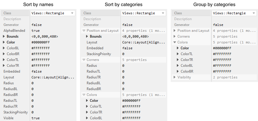 In order to provide better overview, Inspector window has been improved to group and sort the displayed properties by their associated categories. This improvement is especially useful when an object contains many properties. You can choose between three modes: (1) Sort properties by their names, (2) Sort properties by their categories and (3) Group properties by categories as demonstrated in the following screenshots. For more details and the usage of the new modes please see the section Sort and group properties: