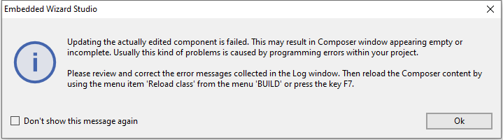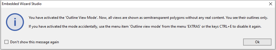 ★Embedded Wizard Studio has been modified to avoid accidentally activating the Outline View Mode and, if the mode has been activated, notify the user about its effect. We learned that the Outline View Mode may confuse less experienced users. They don't understand why the Composer remains empty. Now, new message dialog informs the user when the user has activated the mode as demonstrated below. Additionally, the Outline View Mode is is not stored anymore in the project setting file. After opening a project the Outline View Mode is generally disabled for all Composer pages. Also, the convenience key E has no function anymore in the Composer: