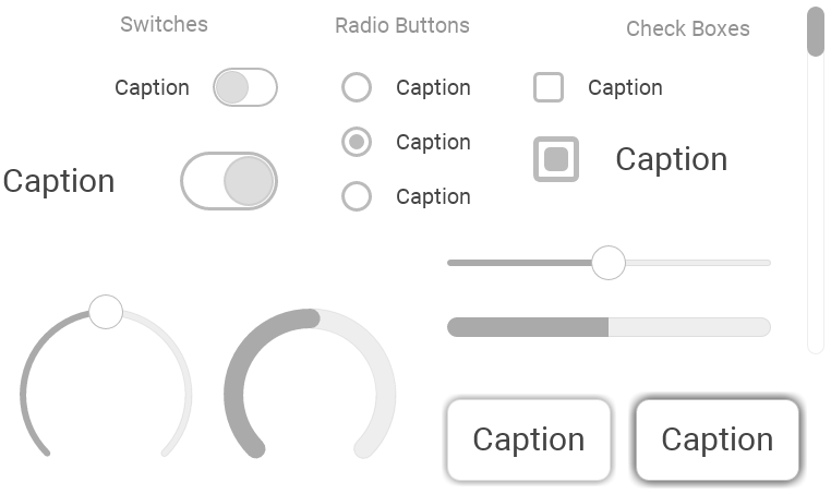 ★All ready-to-use widgets (except the Value Display widget) have been enhanced by new properties permitting you to configure the appearance of the widget without depending on bitmaps. Now, you can specify the desired colors, size parameters, corner rounding and shadow effects directly in the configuration object of the respective widget. In order to be more flexible, all widgets have been enhanced by new visual elements, like Thumb or Accent. This new functionality can of-course be combined with the old functionality involving bitmaps, if desired. For more details please read the documentation describing the respective widget.