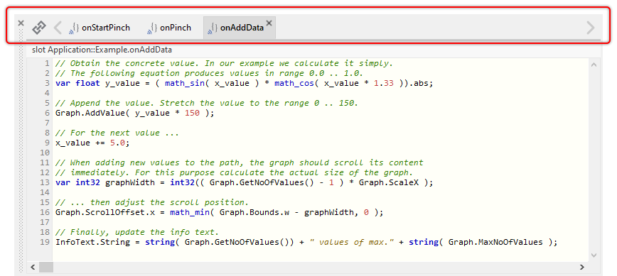 The Code Editor window has been enhanced by functionality to manage multiple editors. For this purpose all recently opened Code Editors are displayed as tabs in a new navigation bar on top of the Code Editor window. By clicking on a tab you can simply switch to the respective editor: