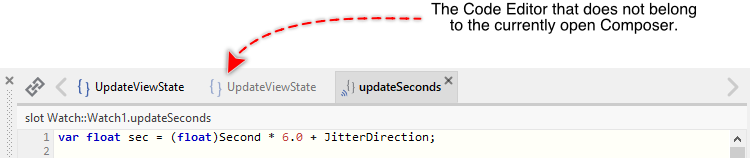 The new bar works similarly to the Navigation bar of the Composer window. In particular, the tabs can be rearranged (moved) using the mouse and undesired tabs can be closed again. To better recognize Code Editors belonging to the actually opened Composer, the tabs of all other editors are slightly faded out as shown below: